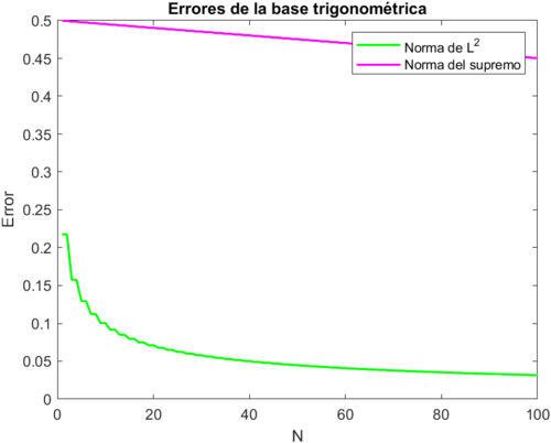 Como podemos observar, la diferencia del error obtenido al considerar la norma [math]L^2[/math] y la uniforme es mucho mayor que en el caso anterior. De hecho, en esta ocasión no es necesario emplear la escala logarítmica. La razón de que el error sea tan grande se debe a la discontinuidad de salto en la función [math]f(x)[/math]. Es notorio sobre todo con la norma del supremo, que es susceptible a las diferencias puntuales. Por tanto, como las aproximaciones tienden al punto medio de los valores de la función en las discontinuidades, siempre va a haber un error mínimo respecto a esa norma. Esto no ocurre con la norma [math]L^2[/math] ya que la integral no tiene en cuenta los conjuntos de medida nula.