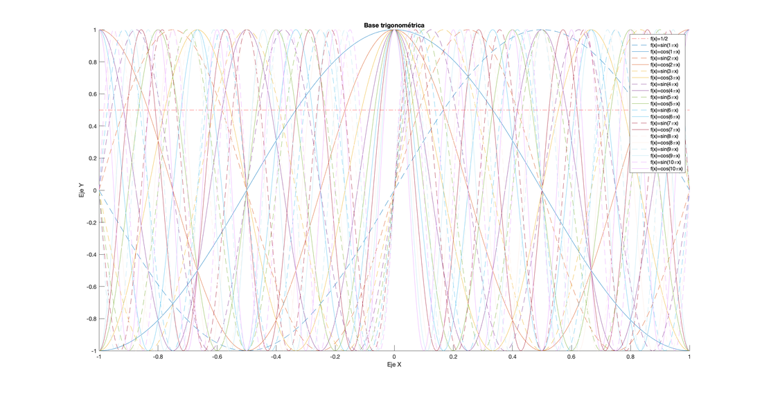 Si dibujamos en una gráfica los [math] 10 [/math] primeros términos de la base trigonométrica [math] \left\{\frac{1}{2} \right\} \cup \left\{\cos \left( n \pi x \right), \sin \left( n \pi x \right) \right\}_{n \in \mathbb{N}} [/math] en el intervalo [math] x \in [-1,1] [/math] obtendríamos lo siguiente: