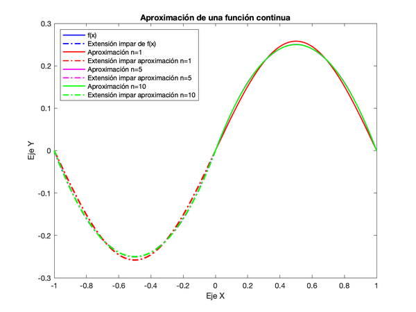 Como función continua, vamos a aproximar [math] f(x)=x(1-x) [/math] en el intervalo [math] [0,1] [/math]. En primer lugar, podemos extender la función de forma impar a [-1,1], manteniéndose la continuidad de la función. Puesto que [math] f(x) \in L^2 (\left[-1,1\right])[/math], la base trigonométrica correspondiente es: