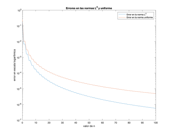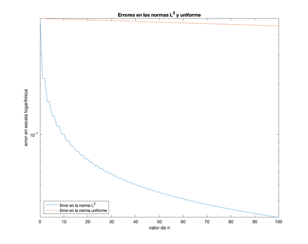 legend('Error en la norma L^2', 'Error en la norma uniforme','Location','southwest')