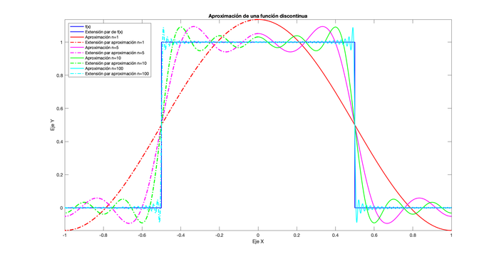 Haciendo uso de Matlab, representaremos las correspondientes [math] f_n(x) [/math] para [math] n=1,5,10 [/math]. Para ello, calcularemos las integrales de los coeficientes de Fourier usando la fórmula del trapecio como aproximación.