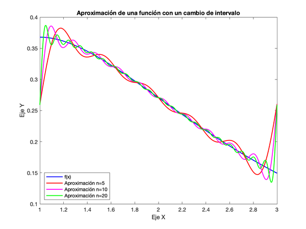 Como se puede observar, de nuevo, cuanto mayor es el valor del parámetro [math] n [/math], mejor se ajusta la aproximación a la función [math] f(x) [/math]. Por último, en los extremos del intervalo se verifica que