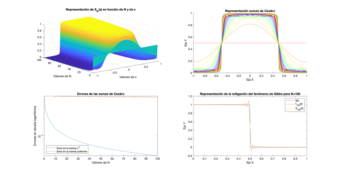 La primera gráfica representa las sumas de Cesàro en función de los valores de N y x en 3 dimensiones. En la segunda gráfica se aprecian las sumas de Cesàro para cada valor de N. La tercera gráfica muestra los errores en las normas [math] L^2 [/math] y uniforme en función de los valores de N. La última gráfica muestra la mitigación del fenómeno de Gibbs al hacer uso de las sumas de Cesàro.