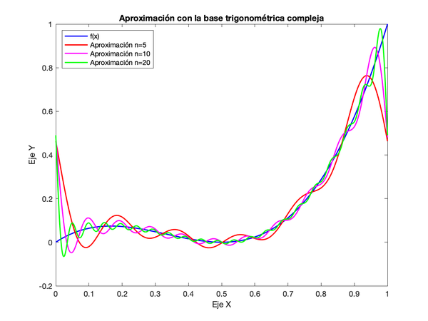 Veamos un ejemplo empleando la base trigonométrica compleja. Tomamos [math] f(x)=4x\left(\frac{1}{2}-x\right)^2 [/math] en el intervalo [math] [0,1] [/math]. Aproximemos ahora dicha función con los primeros [math] 5, 10 [/math] y [math] 20 [/math] términos de la serie.