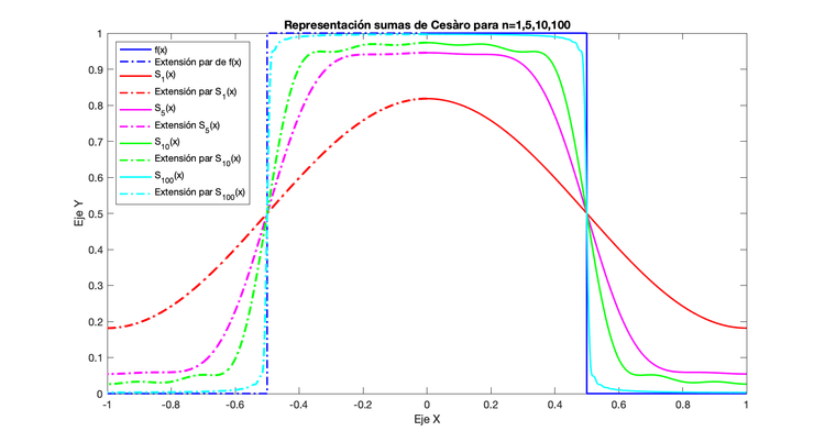 Tal y como hemos mencionado, las sumas de Cesàro reducen las oscilaciones en torno a los puntos de discontinuidad de la función. Además, para un valor de [math] N [/math] lo suficientemente grande, como es [math] N=100 [/math], la representación de las sumas de Cesáro son bastante similares a la función original, a precio de un error mayor, tal y como ya se ha comentado.