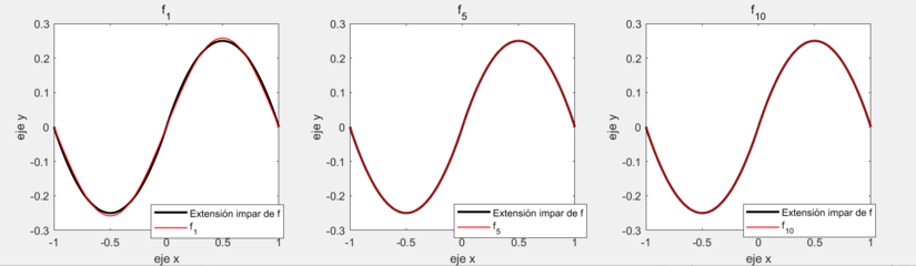 Desde un principio se puede observar que independientemente del valor de [math]n[/math], las [math]f_{n} [/math] aproximan de forma precisa [math]f(x)[/math]. Esto se debe a que la extensión impar es continua en el intervalo [math][-1,1][/math] y comienza y acaba en el mismo valor (0).
