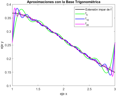 Al igual que antes, sea [math] f \in L^2([a,b])[/math], podemos aproximar la función mediante la serie de Fourier como