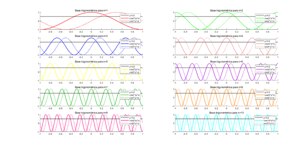 En la siguiente gráfica se representa esta base para los 10 primeros términos con [math][a,b]=[-1,1][/math], correspondiendo la recta negra a la función [math]1/2[/math] , y representados en línea continua y punteada [math]\cos{\left(n\pi x\right)}[/math] y [math]\sin{\left(n\pi x\right)}[/math], respectivamente.