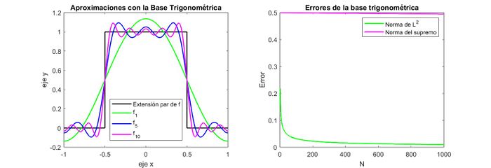 Como podemos observar, la diferencia del error obtenido al considerar la norma [math]L^2[/math] y la del supremo es mucho mayor que al aproximar la función continua de la sección anterior. Esto se debe a que la discontinuidad de salto genera un mayor error en la norma del supremo, pues esta es susceptible a las diferencias puntuales. Como las aproximaciones tienden al punto medio de los valores de la función en las discontinuidades, siempre va a haber un error mínimo respecto a esa norma, en este caso [math]0.5[/math]. Esto, por el contrario, no ocurre con la norma [math]L^2[/math] ya que la integral no tiene en cuenta los conjuntos de medida nula.