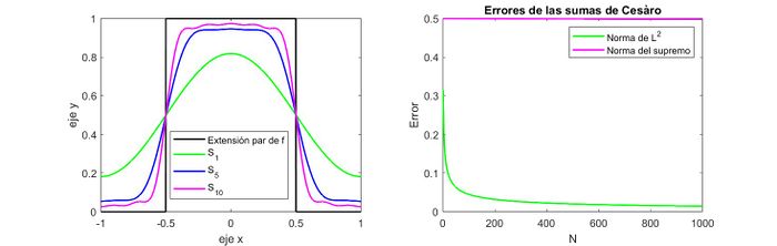 Observamos cómo efectivamente al representar las sumas de Cesàro, se reduce casi al completo la oscilación en torno a los puntos de discontinuidad. Sin embargo, emplear este método presenta un inconveniente, el error aumenta. La razón de esto es que hay una única combinación lineal a partir de la cual se obtiene la función, pues recordemos que estamos considerando una base del espacio [math]L^2[/math]. Por tanto, si tomamos las sumas de Cesàro, que no son más que otra combinación lineal de los elementos de la base, esperaremos un error mayor, al menos en la norma [math]L^2[/math].