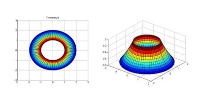 La temperatura proviene de un foco de calor muy concentrado en el origen y viene dada por un campo escalar:[math]T(\rho,\theta)=-\log(\rho+0.1)[/math] Como se puede observar la temperatura varía únicamente con el parámetro [math]\rho[/math], por lo tanto para un mismo valor de éste la temperatura es constante sea cual sea el valor de [math]\theta[/math] comprendido entre 0 y [math]2Π[/math]. Vemos que cuanto mayor es el valor de [math]\rho[/math] la temperatura va disminuyendo debido al sentido negativo de la fórmula; luego los puntos de máxima temperatura serán aquellos que estén más cerca al origen pues están mas cerca al foco.