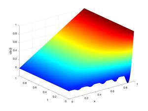 [math] \begin{cases} u_t-\frac{1}{2}u_{xx}=0 & x\in(0,1),t\gt0\\ u(0,t)=0&t\gt0\\ u(1,t)=1&t\gt0\\ u(x,0)=0&x\in(0,1) \end{cases} [/math]
