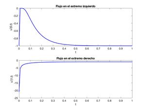 Por la ley de Fourier sabemos que [math] q=-k u_x [/math], siendo q el flujo. Por lo que para interpretar como es el flujo en nuestro problema, vamos a graficar como es en los extremos suponiendo que [math] k=1 [/math].