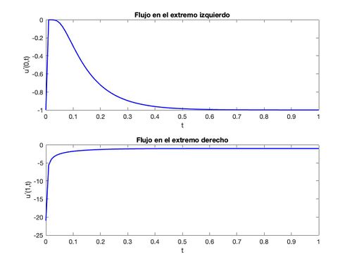 Al observar la gráfica en el extremo izquierdo vemos que al principio no hay flujo debido a que tanto la barra como el extremo están a 0º. Una vez avanza el tiempo el flujo va siendo cada vez más negativo lo que implica que cada vez sale más flujo por el extremo izquierdo. Esto tiene sentido ya que como la barra se va calentando y el extremo se mantiene a 0º el flujo tiende ir de donde hay mayor temperatura a donde hay una temperatura menor.