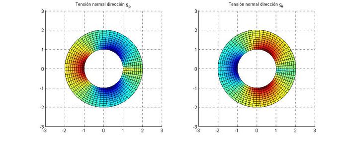 Consideramos una placa plana (en dimensión 2) que ocupa el anillo comprendido entre las circunferencias centradas en el origen de radios 2 y 1. En ella vamos a suponer que tenemos definidas dos cantidades físicas: la temperatura [math]T(\rho,\theta,t)[/math], que depende de las dos coordenadas polares [math](\rho,\theta)[/math] y el tiempo [math]t[/math], y los desplazamientos [math]\vec u(\rho,\theta,t)[/math]. De esta forma, si definimos [math]r_0(\rho,\theta)[/math] el vector de posición de los puntos de la placa en reposo, la posición de cada punto [math](\rho,\theta)[/math] de la placa en un instante de tiempo [math]t[/math] viene dada por: [math] \vec r (\rho,\theta,t)= \vec r_{0}(\rho,\theta)+\vec u(\rho,\theta,t). [/math] Vamos a suponer que sobre la placa se ha aplicado una fuerza que ha provocado una vibración de manera que los desplazamientos en un tiempo [math]t_0[/math] dado vienen dados por: [math] \vec u(\rho,\theta)=\frac{\sin(\pi \theta/2)}{30\rho}\vec g_{\rho}. [/math]