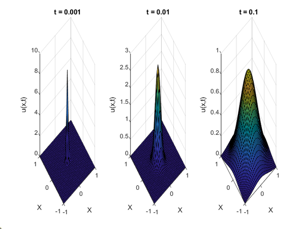Para obtener una mayor visión de dicha solución, se representará en diferentes instantes de tiempo, [math] t \in (0.001, 0.01, 0.1) [/math] y en el espacio [math] x \in [-1,1] [/math]