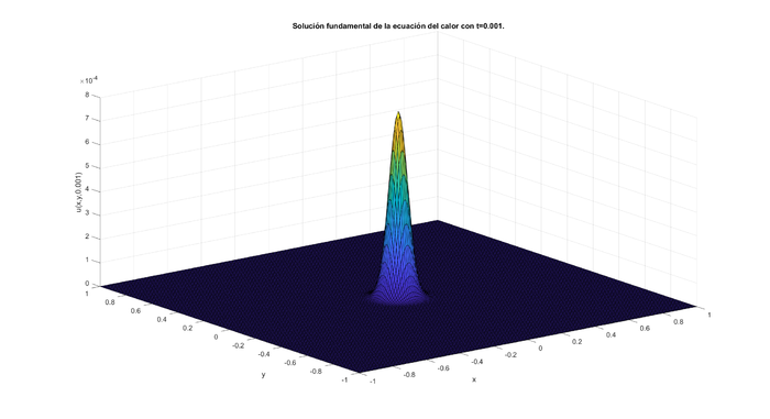 Para acabar, trataremos de observar la forma de la solución de la ecuación del calor para una dimensión más, dimensión 2. La ecuación del calor para dimensión [math]n\gt1[/math] en [math]\mathbb R[/math] es: