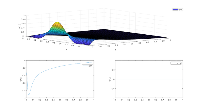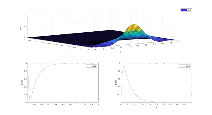 En este caso, como queremos observar el flujo de calor en los extremos de la varilla, tendremos que el flujo en un tiempo [math]t[/math] en el extremo [math]x=0[/math] vendrá dado por la función de [math]t[/math], [math]q(0,t)[/math] y el flujo en un tiempo [math]t[/math] en el extremo [math]x=1[/math] vendrá dado por la función de [math]t[/math], [math]q(1,t)[/math]. Estas funciones tienen las siguientes expresiones: