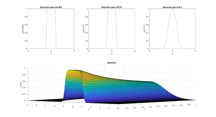 En la parte superior se muestran representaciones de la solución [math]u[/math] para distintos valores de [math]t[/math] en función de [math]x[/math] para [math]x\in[-5,5][/math]. La primera lo hace para [math]t=0.001[/math], la segunda para [math]t=0.01[/math] y la tercera para [math]t=0.1[/math]. En la parte inferior se muestra la gráfica en 3 dimensiones de la solución para [math](x,t)\in[-5,5]\times[0,1][/math].