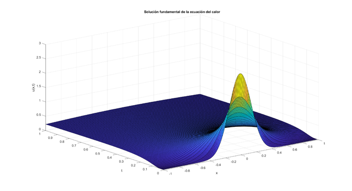 Representación de la función fundamental u, dibujada para [math](x,t)\in[-1,1]\times[10^{-2},1].[/math]