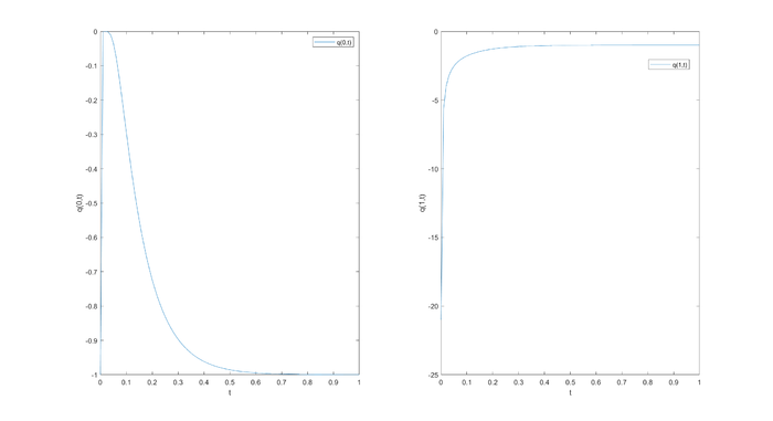 Gráficas del flujo de calor en [math]x=0[/math] y en [math]x=1[/math]. En la primera se muestra el flujo de calor en [math]\{0\}\times[0,1][/math] en función del tiempo, mientras que en la segunda se muestra el flujo en [math]\{1\}\times[0,1][/math], también en función del tiempo.