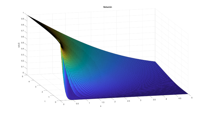 A continuación, representaremos esta solución en una gráfica. En este caso, se hará la representación para [math](x,t)\in[0,5]\times [0,5][/math], logrando así la siguiente figura: