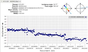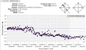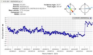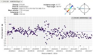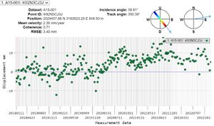 Segundo punto: Hotel Ritz Madrid: tanto el ascending como el descending recogen un distanciamiento del punto, por lo que podría tratarse de un hundimiento del punto estudiado. En el caso del descending, la velocidad a la que lo está haciendo es bastante inquietante: 7mm por año.