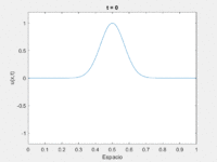 En el video anterior se puede observar como tarda una unidad de tiempo en recorrer una unidad de espacio ya que el pico de la onda en t = 0 empieza en x = 0.5 y vuelve a x = 0.5 en t = 1. Sin embargo, una vez alcanzada la frontera de x = 1, la onda cambia de signo y de sentido. Este hecho vuelve a ocurrir cuando alcanza la próxima frontera x = 0, donde vuelve a tomar el signo positivo y el sentido inicial. Esto se repite cada vez que alcanza una frontera. Además, se puede observar que en t = 2, la onda vuelve a ser igual a la inicial, comprobando así que el periodo T es igual a 2.
