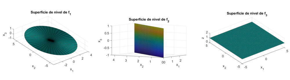 Gráficamente, las superficies de nivel del campo escalar \(f_1\) representan elipses centradas en el origen, las de \(f_2\) representan planos inclinados que pasan por el eje \(x_3\), y las de \(f_3\) representan planos horizontales a "cota" \(c\).