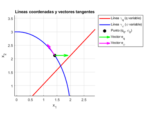 - \(\vec{e}_q\) (en verde): Es el vector tangente a la línea \(\gamma_q\) en el punto específico, paralelo al eje \(q\).