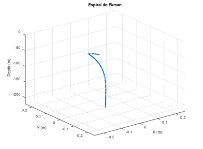 Por lo tanto, la espiral de Ekman en coordenadas cilíndricas será: [math] \left ( \rho ,\theta ,z \right )=\left ( v_{0}e^{z/d_{E}},\frac{z}{d_{E}}+\vartheta,z \right ) [/math]