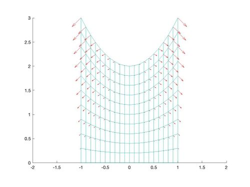 Estudiaremos si alguno de los puntos del mallado del campo de desplazamientos se quedan fijos. Para poder comprobar esto, dibujamos un mallado que indique el movimiento de cada uno de los puntos que componen a este. El desplazamiento estará indicado por las flechas.