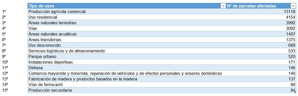 Por último se muestra una tabla con las áreas afectadas por la DANA en función de su uso.