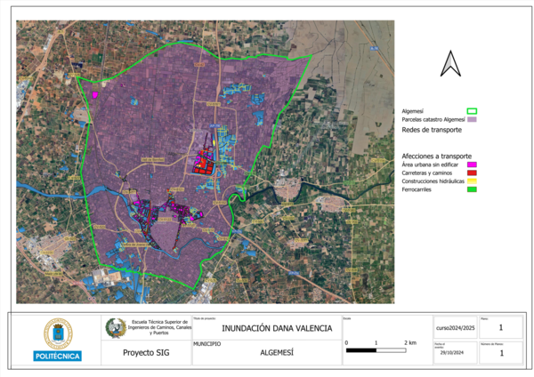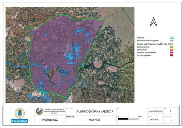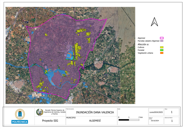 Este trabajo tiene como objetivo analizar las consecuencias de la DANA (Depresión Aislada en Niveles Altos) que el 29 de octubre de 2024 impactó con especial dureza en el municipio de Algemesí, en la provincia de Valencia. Este fenómeno extremo provocó lluvias torrenciales, inundaciones y vientos intensos, dejando a su paso al menos tres fallecidos, numerosos heridos y cuantiosos daños materiales.