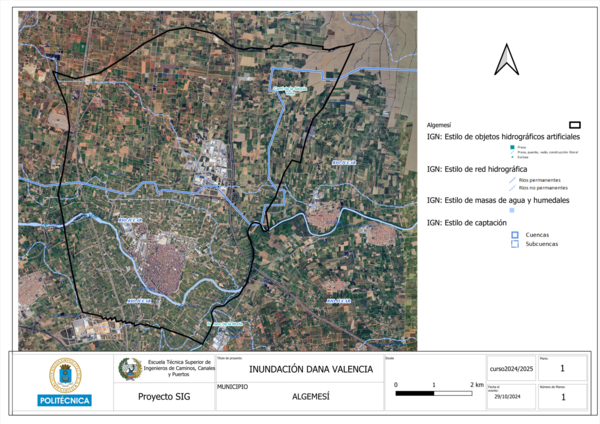 En este apartado se analiza el desarrollo del evento de la DANA y sus efectos en la región, con especial atención a Algemesí. Inicialmente, se presenta la red hidrográfica de la zona, destacando el curso del río Magro, que atraviesa la zona urbana de Algemesí y representa el mayor riesgo para la población debido a su cercanía. En contraste, el río Júcar, aunque también cruza Algemesí, afecta principalmente a las áreas agrícolas, y eso lo convierte en una amenaza menos directa para los núcleos habitados.