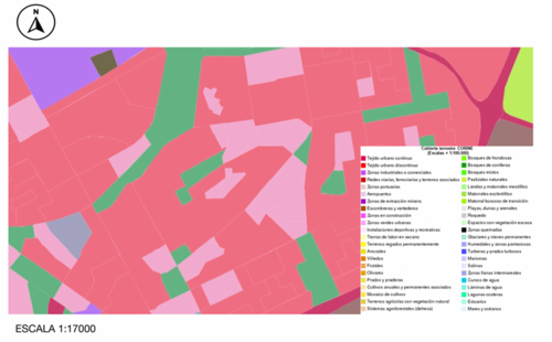 Finalmente, en todos estos planos se ha utilizado un esquema de impresión para incluir la leyenda identificativa, la escala y el N(Norte). Para el plano de usos del suelo hemos utilizado la herramienta Iberpix (https://www.ign.es/iberpix/ ) utilizando la capa de fondo disponible” Ocupación del suelo”):