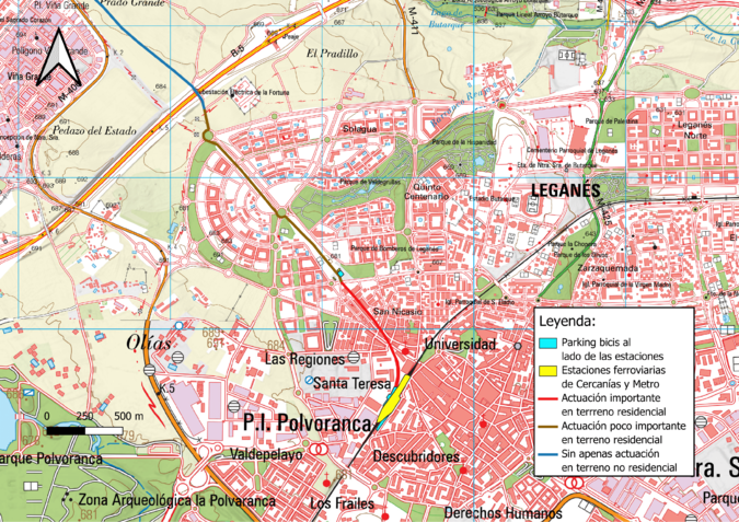 En los planos anteriores, el área ocupada por el antiguo ferrocarril se representa en color amarillo, destacando su importancia en el pasado. Esta línea de vía ancha, que conectaba Cuatro Vientos con Leganés, entró en funcionamiento el 11 de enero de 1926 y estaba destinada principalmente al transporte de material de artillería. Su construcción con ancho ibérico permitía enlazarla con la red ferroviaria nacional. Posteriormente, en 1943, la línea fue prolongada hasta llegar a Campamento.