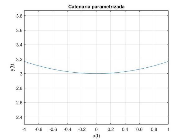 La ecuación en el plano de la curva de la catenaria es [math]y=Acosh(\dfrac{x}{A})[/math] en la que el valor de A marca el vértice de la curva para x=0. La parametrización la curva curva en coordenadas cartesianas en función del tiempo [math]t[/math] es la siguiente: