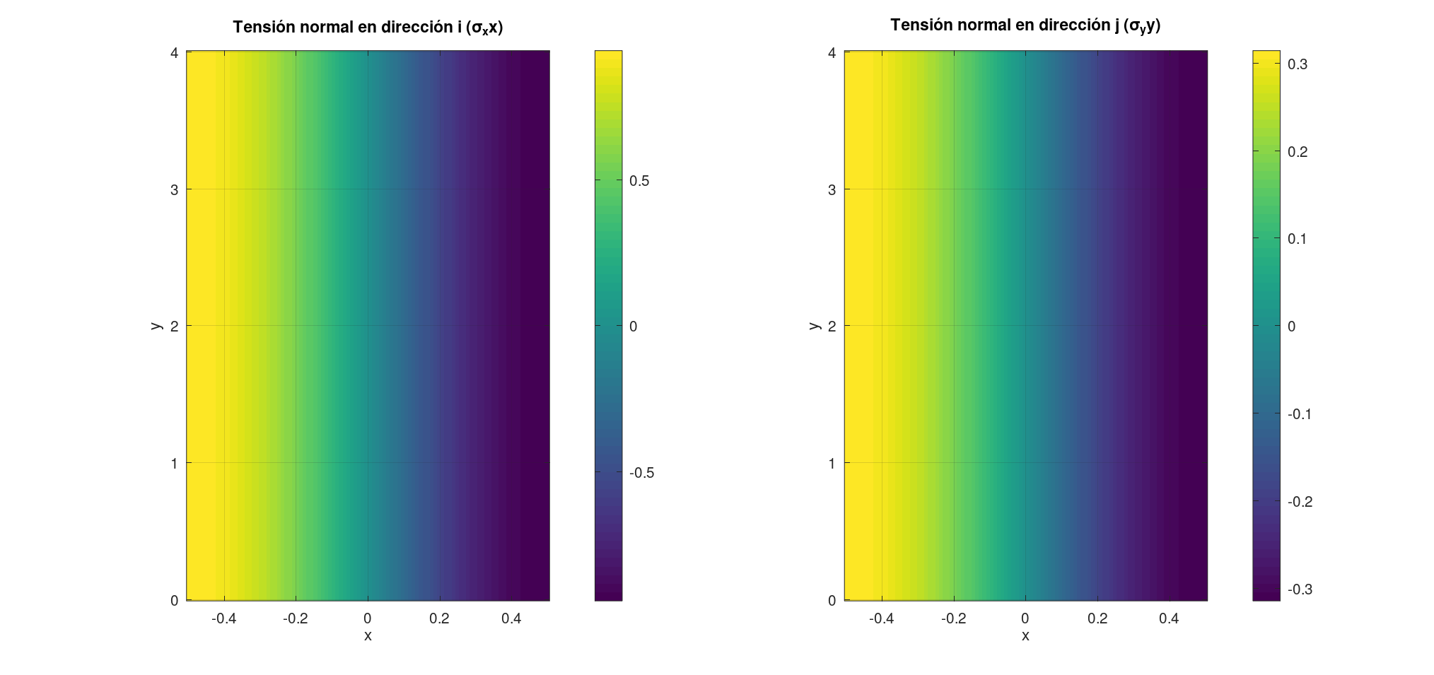 La gráfica de la izquierda muestra cómo la onda longitudinal genera tensiones internas en la dirección de propagación. Los valores positivos se representan con colores cálidos que indican tracción (es decir, los lugares en los que el material se estira) y los valores negativos, con colores fríos que indican compresión. En el caso de la gráfica de la derecha, esta aparece casi sin variaciones, ya que el desplazamiento no depende de la variable y, solo de la x. Esto indica que en la dirección vertical no hay apenas tensiones normales inducidas por la onda longitudinal.
