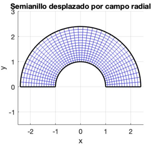 Campo de desplazamiento en polares: [math]\vec{u}(\rho,\theta) = \frac{1}{5}(\rho - 1)\rho \,\vec{e}_{\rho}[/math]