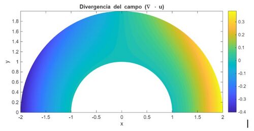 La divergencia es una medida del cambio de volumen local que ocurre a causa del desplazamiento. En este caso, nos permite identificar las zonas del semianillo donde el material se expande o se comprime.