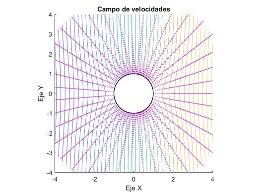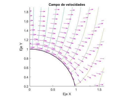 Y siendo u nuestra función del campo velocidades [math] \vec{u}= \left(1-\frac{1}{\rho^2}\right)\cos\theta\,\vec{e}_\rho - \left(1+\frac{1}{\rho^2}\right)\sin\theta\,\vec{e}_\theta [/math]