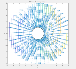 Observamos como nuestro campo es ortogonal a las curvas de nivel.