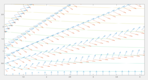 Una vez se obtiene tanto [math]\psi[/math] como [math]\vec{v}[/math], se introducen en MATLAB, así comprobando que efectivamente los vectores que componen [math]\vec{v}[/math] son ortogonales a las líneas de corriente de [math]\psi[/math]. Para ello se ha empleado el siguiente código: