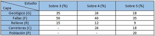 A modo de ejemplo diremos que las fallas tienen una mayor importancia en un posible terremoto que el relieve del terreno. El resultado de estas valoraciones se muestra en la tabla siguiente.
