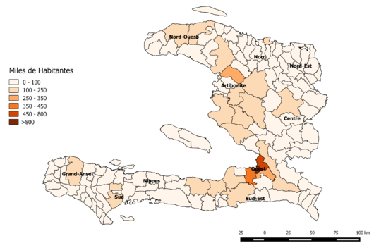 Un análisis más detallado al tercer nivel administrativo nos lleva a la división de la población de Haití, que figura ten la imagen de la derecha, en función la distribución administrativa de tercer nivel.