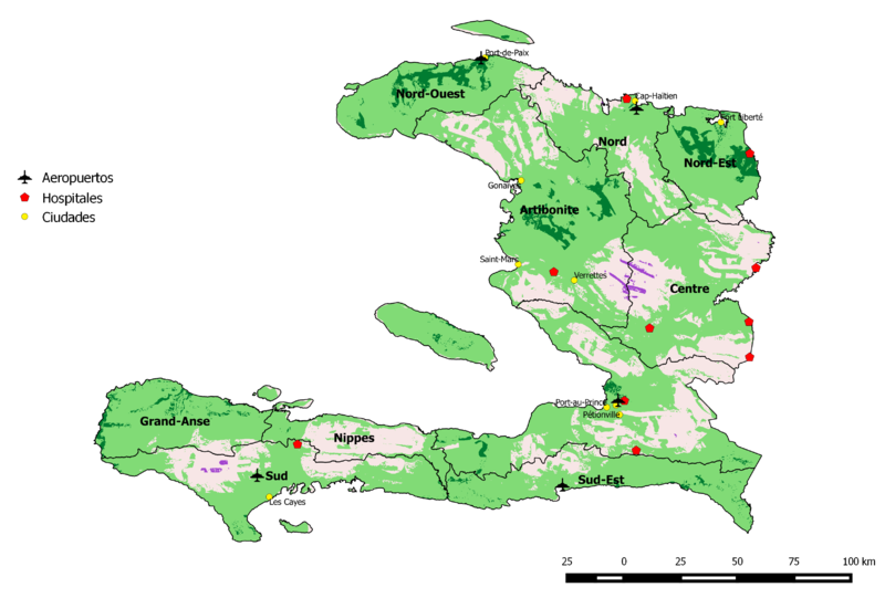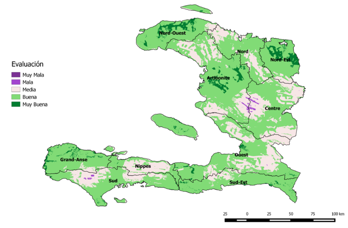 A. El análisis del territorio de Haití muestra una gran dispersión de zonas con una alta calidad del terreno según la evaluación del relieve, el geológico y las fallas, siendo la más continua en calidad la que abarca casi por completo la totalidad del Departamento Nord-Est, además de una amplia zona en el Nord-Ouest, en la central de Artibonite, por el este de Grande-Anse y, asimismo, la totalidad de la Île de la Gonâve, isla que se ubica en frente de Puerto Príncipe.