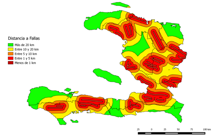 Por último hacemos un análisis de la influencia de las fallas. Para ello usamos el mapa de fallas obtenido del MINUSTAH, que es un archivo shape vectorial, hacemos unos buffers de cuatro distancias fijas (1, 5 ,10 y 20 km). Evaluándolos en función de que cuanta más distancia haya a la falla, menos vulnerable es la zona de sufrir daños por sismos; y al revés, si está más cerca, más vulnerabilidad y posibilidad de daños. Se la asignan valores de 1, 3, 5, 7 y 10 a los intervalos de distancia, siendo 1 muy poca repercusión del daño (10%) y 10 alta repercusión de los daños y gravedad de los mismos (100%).