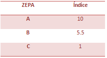 En la red natura ZEPA (Zonas de especial protección para las aves), la tabla de atributos mostraba tres zonas diferentes, zona A, zona B y zona C. La zona con mayor necesidad de protección es la zona A, ya que se trata de aves menos abundantes en el territorio con necesidad de protección. Por ello, el criterio que hemos escogido para adoptar un índice dependiendo de cada zona es el siguiente: