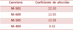 - Con diferentes valores obtenidos de los coeficientes de afección se ha realizado una tabla que muestra el coeficiente de afección de cada aspecto en cada carretera.